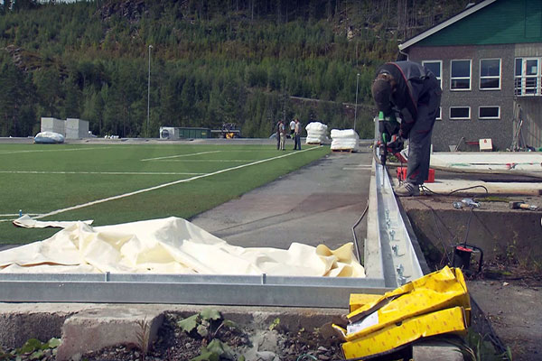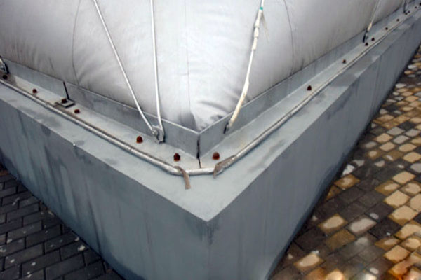 氣膜建筑膜體的下沿與基礎(chǔ)梁的連接,用專(zhuān)用的鋼質(zhì)夾具壓邊,用鏍栓連接到基礎(chǔ)梁中預(yù)埋的錨桿上,再將鋼纜穩(wěn)定(應(yīng)力控制)系統(tǒng)連接到錨桿上。