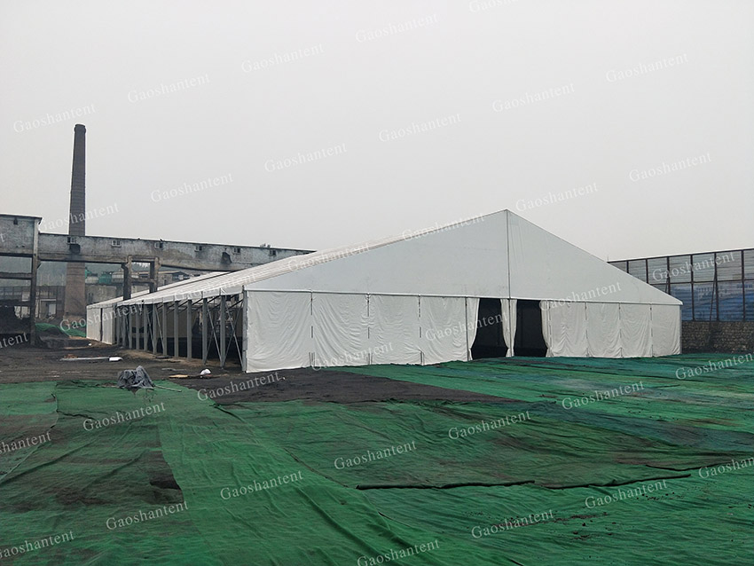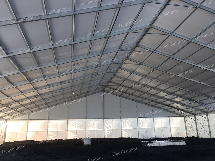 與傳統(tǒng)建筑相比,篷房本身屬于臨時(shí)建筑,不需要繁瑣的審批手續(xù),高山利用客戶(hù)園區(qū)自由場(chǎng)地,建造跨度50m、頂高15m的全鋁合金倉(cāng)儲(chǔ)中轉(zhuǎn)空間,隨著加工地點(diǎn)、環(huán)保要求的變化,靈活實(shí)現(xiàn)可移動(dòng),從容解決環(huán)保難題。