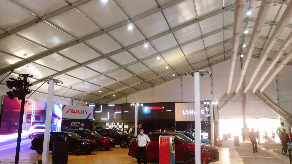 在一些車展、汽車發(fā)布會上,往往就會應(yīng)用到裝配式篷房建筑。使用篷房的好處很明顯:利用篷房內(nèi)部空間無立柱的特性,無死角對汽車進(jìn)行展示;使用篷房與定制化廣告牌、廣告板、特殊品牌標(biāo)志、燈光效果相結(jié)合,營造出驚艷的視覺效果;在銷售區(qū)、餐飲區(qū)、醫(yī)療保障區(qū)搭建篷房,解決功能性空間不足的問題。