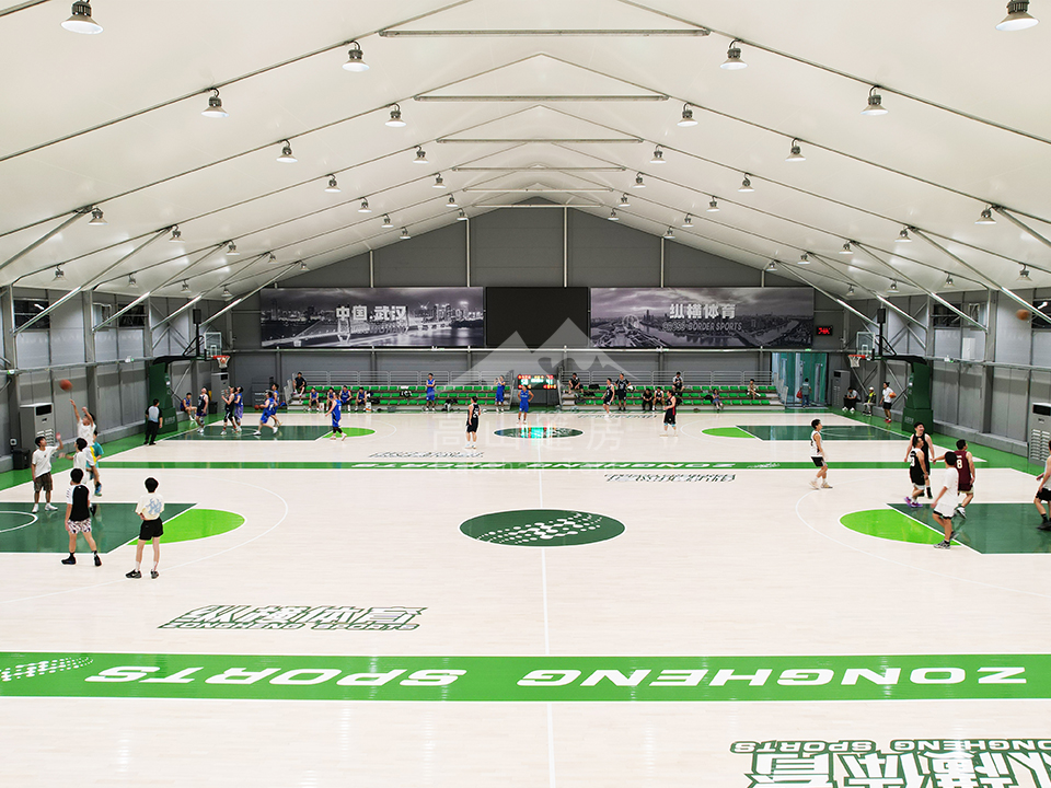 篷房內(nèi)部采用無柱大跨度設(shè)計,最大跨度可達(dá)60米,提供開闊、完整的運動視野,空間利用率高。這種結(jié)構(gòu)使其能夠靈活適配籃球、羽毛球、網(wǎng)球、冰球等多種運動項目,并可以快速轉(zhuǎn)換場地功能,輕松兼顧小型音樂會、展覽等商業(yè)或社區(qū)活動,實現(xiàn)“一篷多能”。