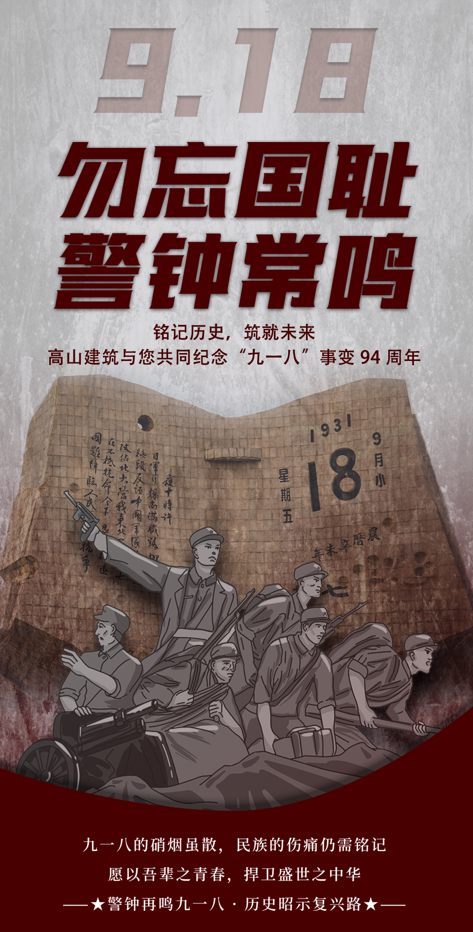 九十四年風雨滄桑,“九一八”的警鐘依然長鳴。這一天,是中華民族刻骨銘心的痛楚,也是激勵我們自強不息、奮發(fā)圖強的精神源泉。高山篷房建筑科技(遼寧)有限公司在此莊嚴時刻,與全國人民一同緬懷歷史、致敬英烈,勿忘國恥,珍愛和平。